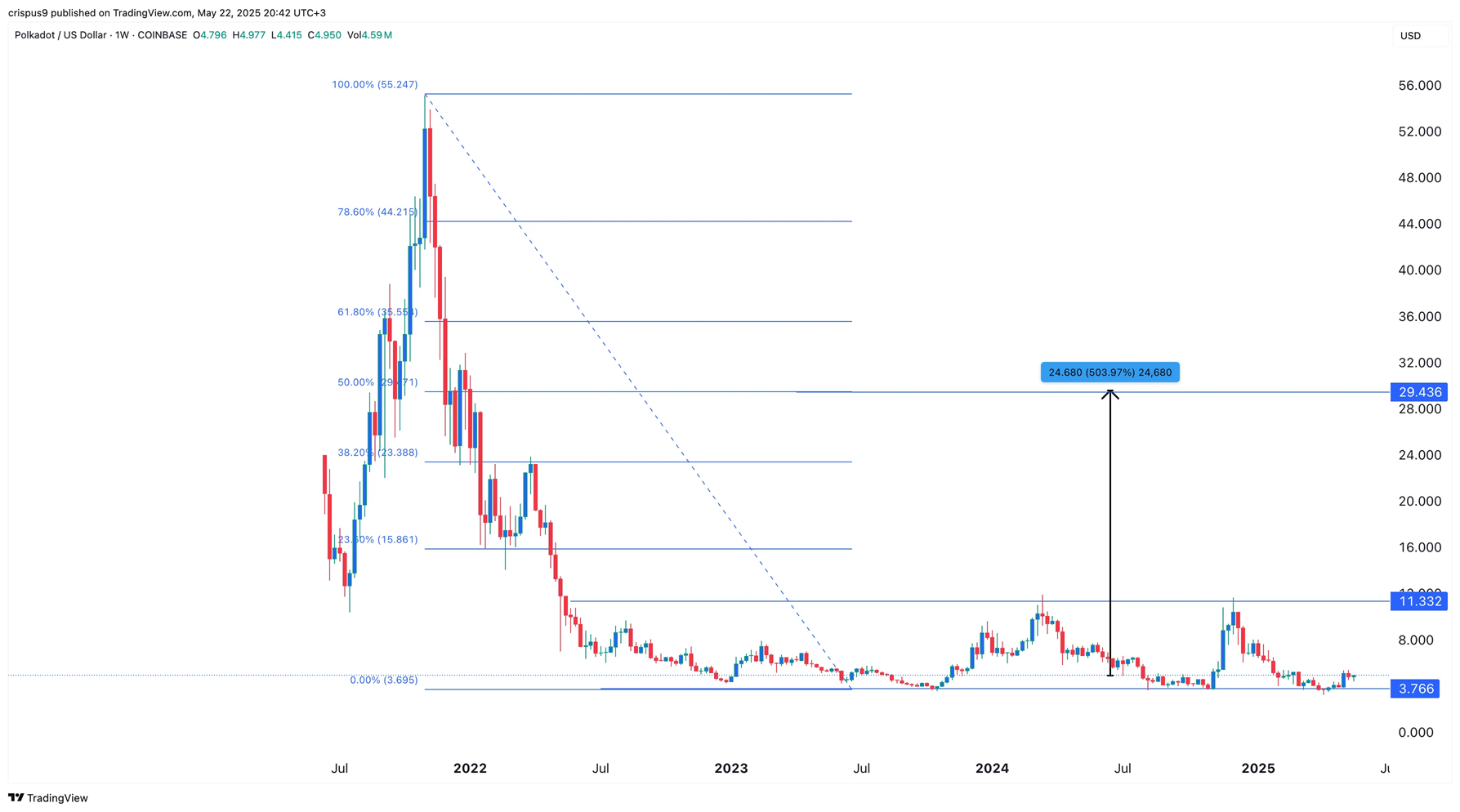 In addition, DOT has formed a triple bottom pattern at $3.76 – a strong technical signal that shows strong support. If the resistance level of $11.33 is broken, DOT could advance to the 50% Fibonacci level at $30, representing a gain of more than 500% from the current price.