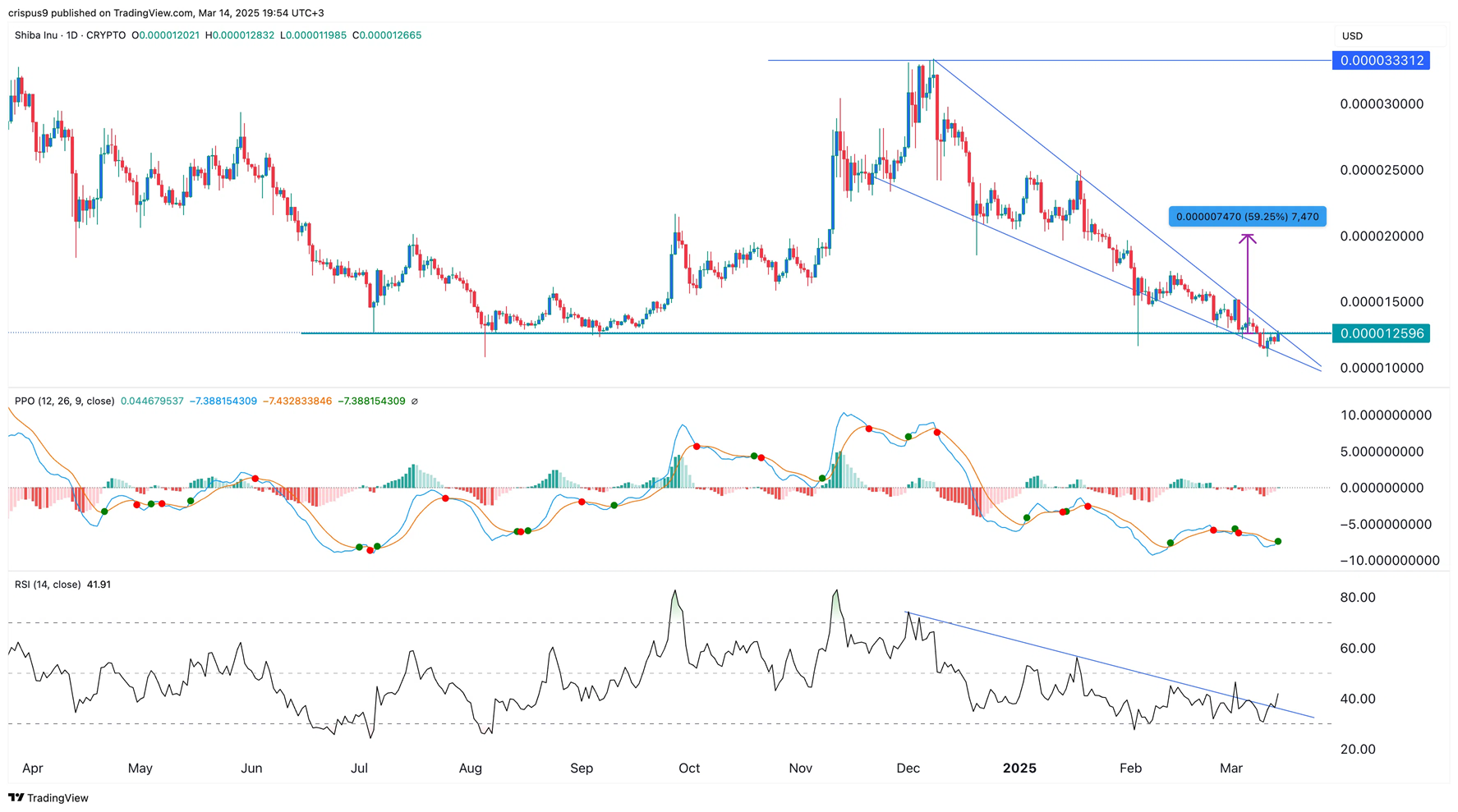 Technical analysis shows that SHIB is forming a falling wedge pattern, which is often considered a signal for a strong bullish breakout. The current key support level is $0.00001260, which coincides with the lows in July, August, and September of last year. If SHIB breaks through this resistance, the next price target could be $0.000020, which represents a gain of about 60% from the current price.