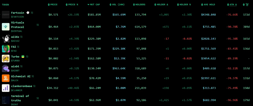 The heat from Fartcoin and Clankeronbase has led to a series of other AI tokens rising: