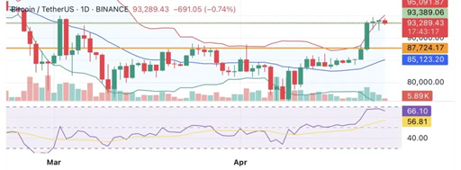 On the technical chart, Bitcoin has just broken through the key resistance zone of $87,724, currently trading around $93,289 at the time of writing. The RSI (Relative Strength Index) is at 66.10, approaching overbought territory but still supporting the uptrend.