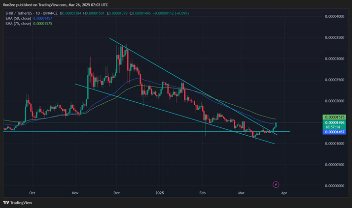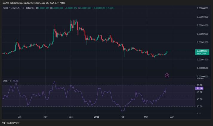 Shiba Inu (SHIB) recorded a nearly 10% increase on March 26, 2025, reaching an intraday high of $0.00001485. This surge has brought SHIB’s market capitalization to $8.6 billion, pushing it past coins like Sui (SUI) and Hedera (HBAR) to become the 19th largest crypto asset according to data from CoinGecko.