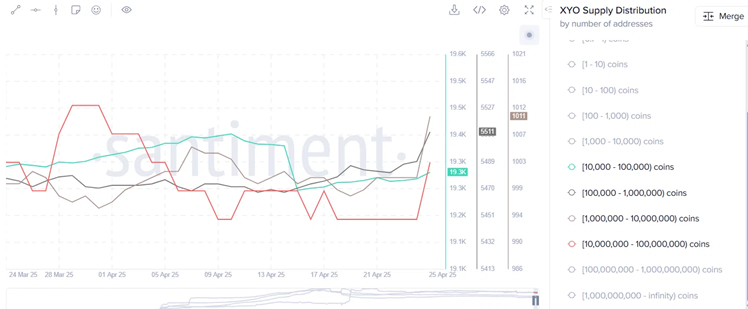 According to data from Santiment, the number of wallets holding between 10,000 and 100 million XYO tokens is also increasing steadily, indicating an accumulation trend from medium and large investors – which is often a signal of expectations for price increases in the near future.