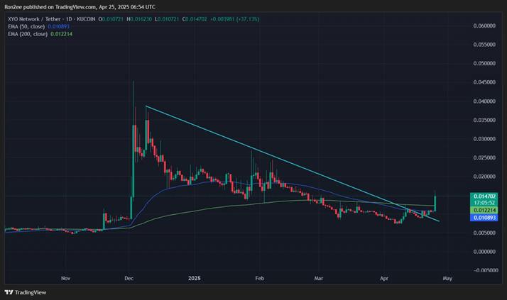 On the XYO/USDT daily chart, the token has officially broken above its long-term downtrend line, and is now above both its 50- and 200-day moving averages – two levels that are considered benchmarks for confirming a long-term uptrend.